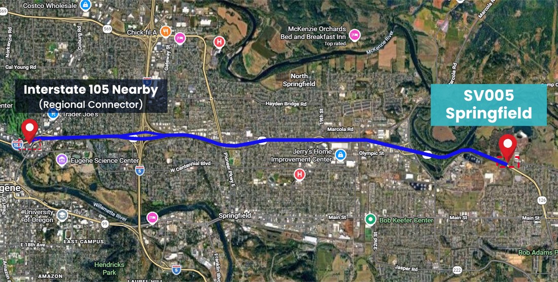 Located at 5105 High Banks Road with direct access to Highway 126 and Interstate 5, providing strong visibility, convenient access, and efficient regional connectivity.